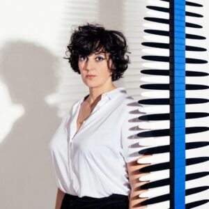 “In its structure, this work (steel, glass, two-way mirror, wood, cables, nylon fabric) resembles a large chandelier set slowly in motion by a motor. This drawing in space is the third version of the Sculptures de silence project. The six columns suspended inside the structure, consisting of two-way mirrored discs stacked and supported by cables, are sound pictures of the word ‘silence’.” Bernard Moninot